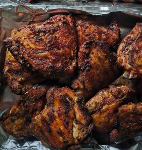 Juicy half-chicken brined and smoked until golden brown. Glazed with a rich maple bourbon reduction for a deep, smoky-sweet finish.